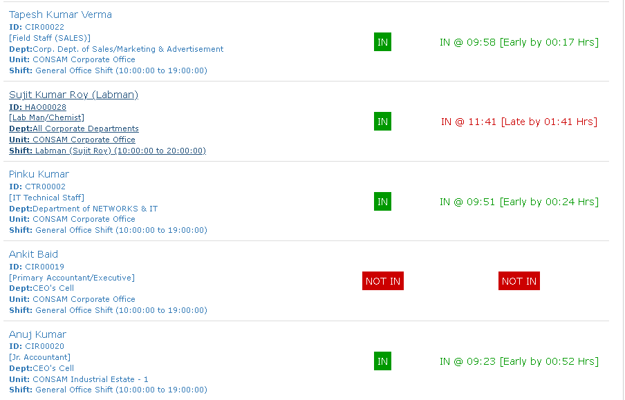 Glimpse at the daily report > IN, Absent, Late & Early IN