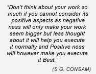 " आप अपने कार्य के लिए ज्यादा न सोचें अगर आप कार्य के सकारात्मक पहलुओं पर विचार न कर पा रहे हों क्यूंकि नकारात्मकता सिर्फ आपके कार्य को बड़ा होने को प्रतीत करेगा जबकि कार्य पर कम विचार कार्य को सामान्य रूप से कार्य निष्पादित करने में मदद करेगा यदपि सकारात्मकता आपसे सर्वश्रेष्ठ रूप से कार्य निष्पादित करवाएगा! " (एस० जी० कॉनसम)